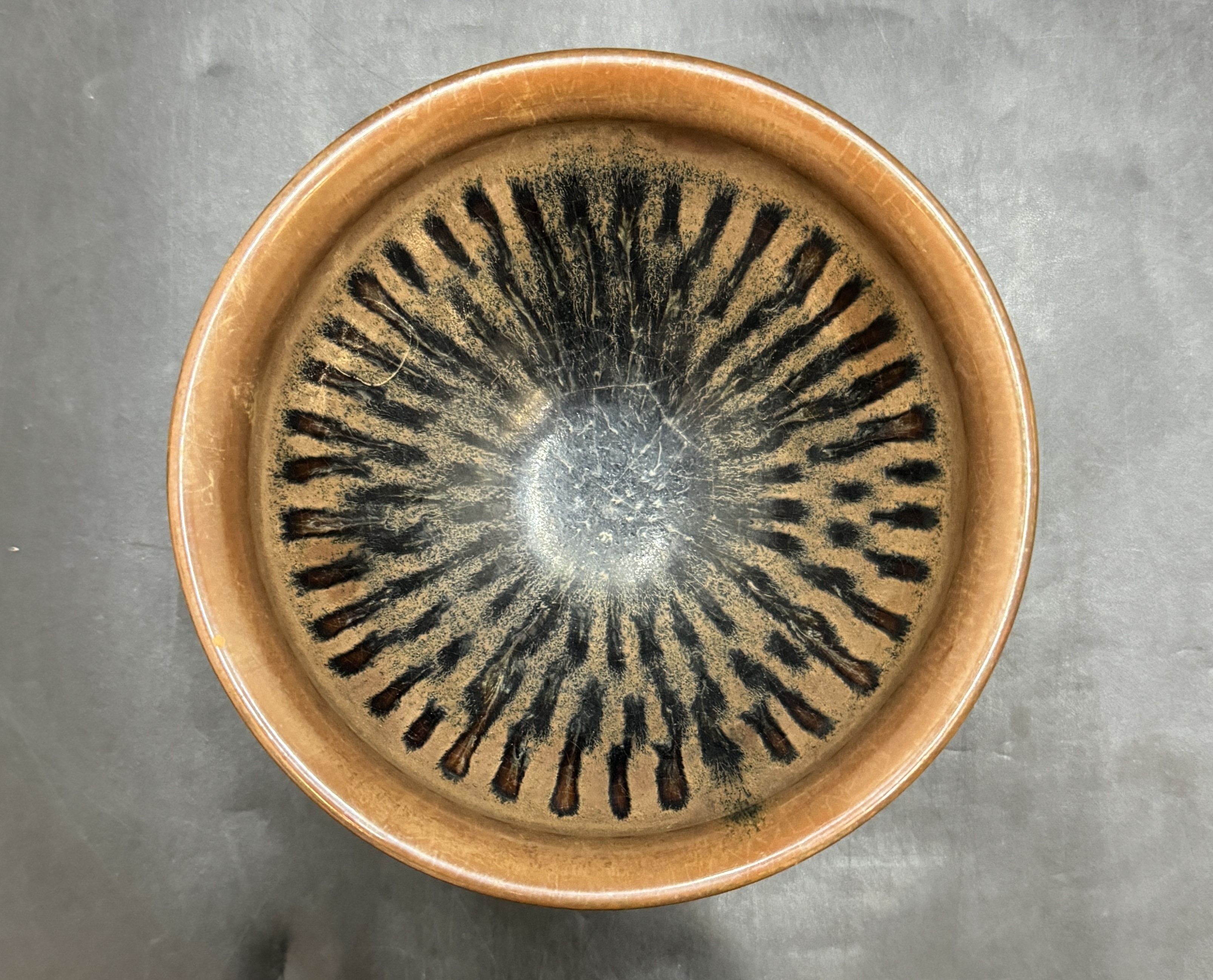 它胎質堅致,色呈深褐,“鐵胎”特征鮮明,上手厚重古樸,盡顯古器沉韻。釉面斑紋堪稱天工絕唱,黑褐釉地間,條狀斑紋如星火迸濺、似兔毫飛揚,在光影下流轉著神秘金屬光澤——這是建窯工匠對火與釉的極致掌控,每一道斑紋都是獨一無二的藝術孤品。器型為經(jīng)典束口盞,口沿微束、器壁斜收,既契合宋代斗茶的實用需求,又盡顯宋式器物的簡約雅正。