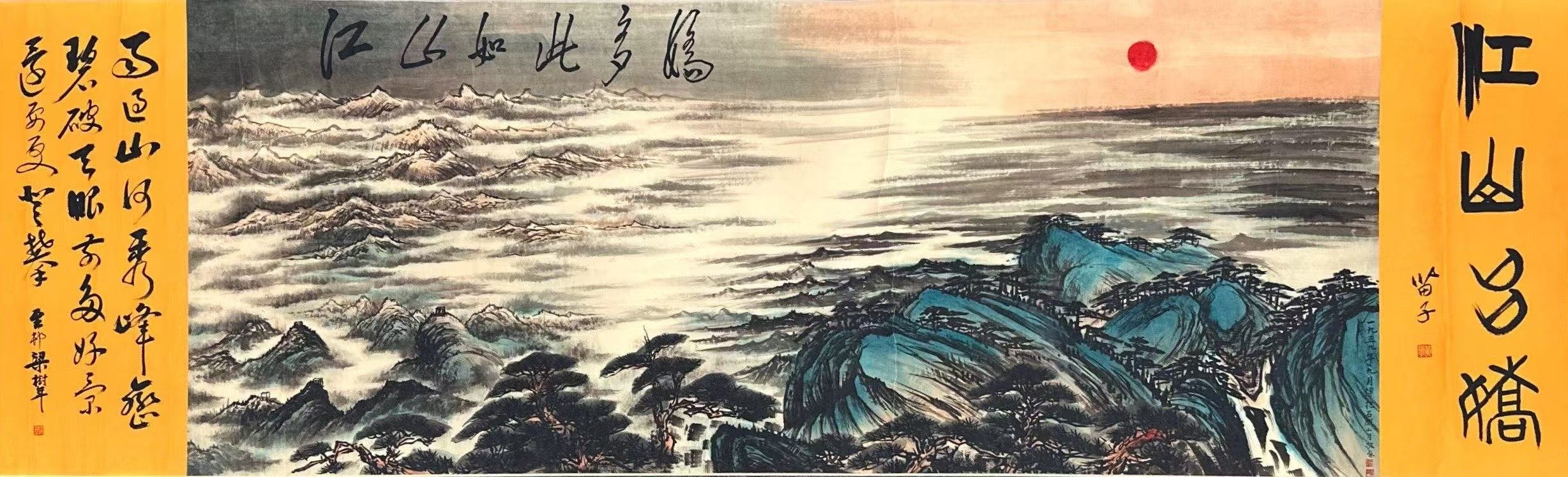 當(dāng)傅抱石的潑墨豪情邂逅關(guān)山月的工寫妙筆,一幅《江山如此多嬌》便成了中國美術(shù)史上的璀璨明珠。這幅巨作以青綠山水的雄渾筆墨,鋪陳出神州大地的萬千氣象:逶迤群山如巨龍盤踞,云海翻騰似銀浪奔涌,一輪紅日躍于天際,將山河暈染得壯麗磅礴。傅抱石的“散鋒筆法”讓山巒盡顯蒼勁靈秀,關(guān)山月的細(xì)膩暈染則讓云氣、霞光層次萬千,兩人技法交融,于尺幅間構(gòu)建出“咫尺千里”的視覺震撼,把毛澤東詩詞中“江山如此多嬌”的豪邁意境,具象成可感可觸的山河長卷。