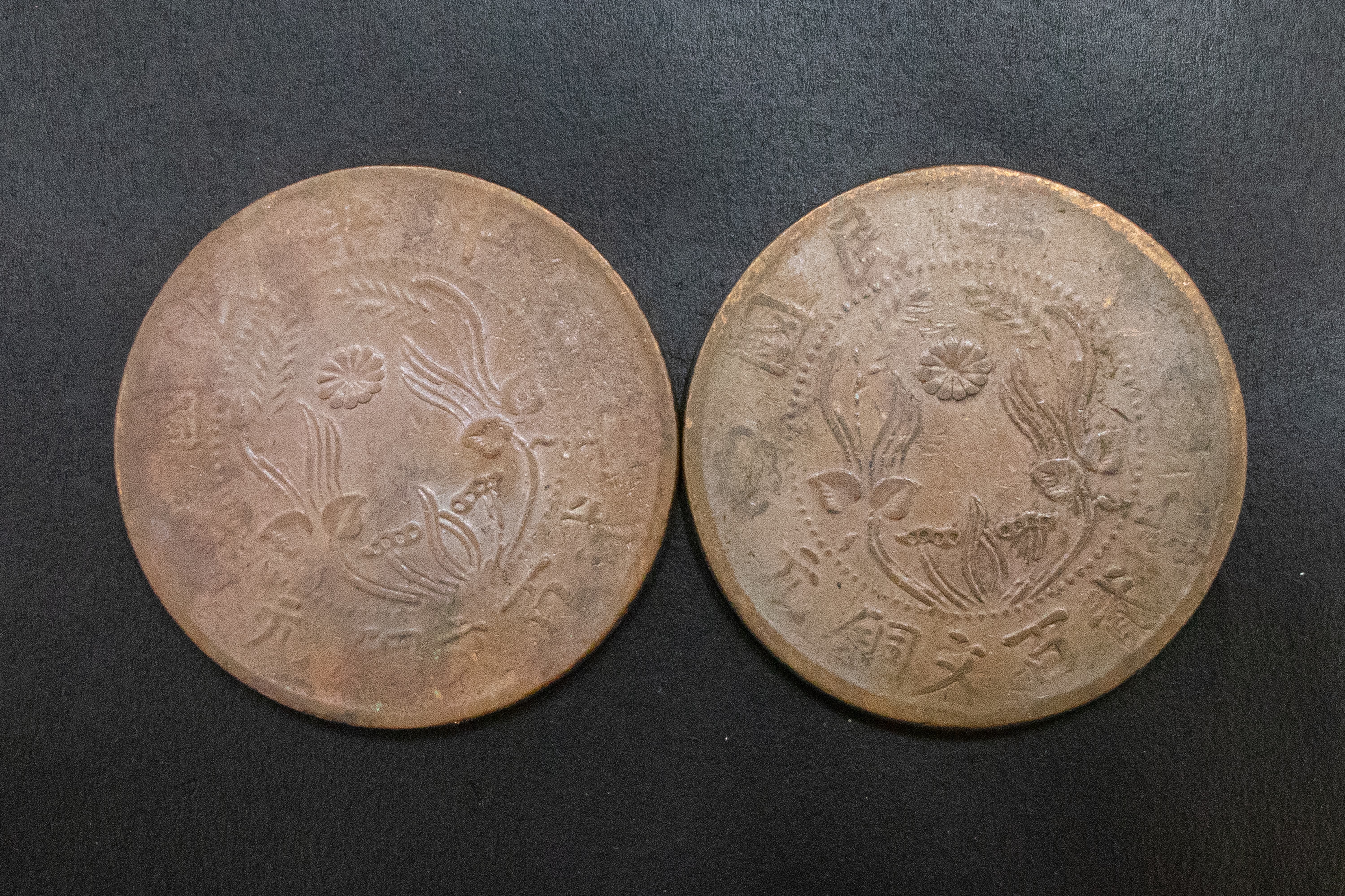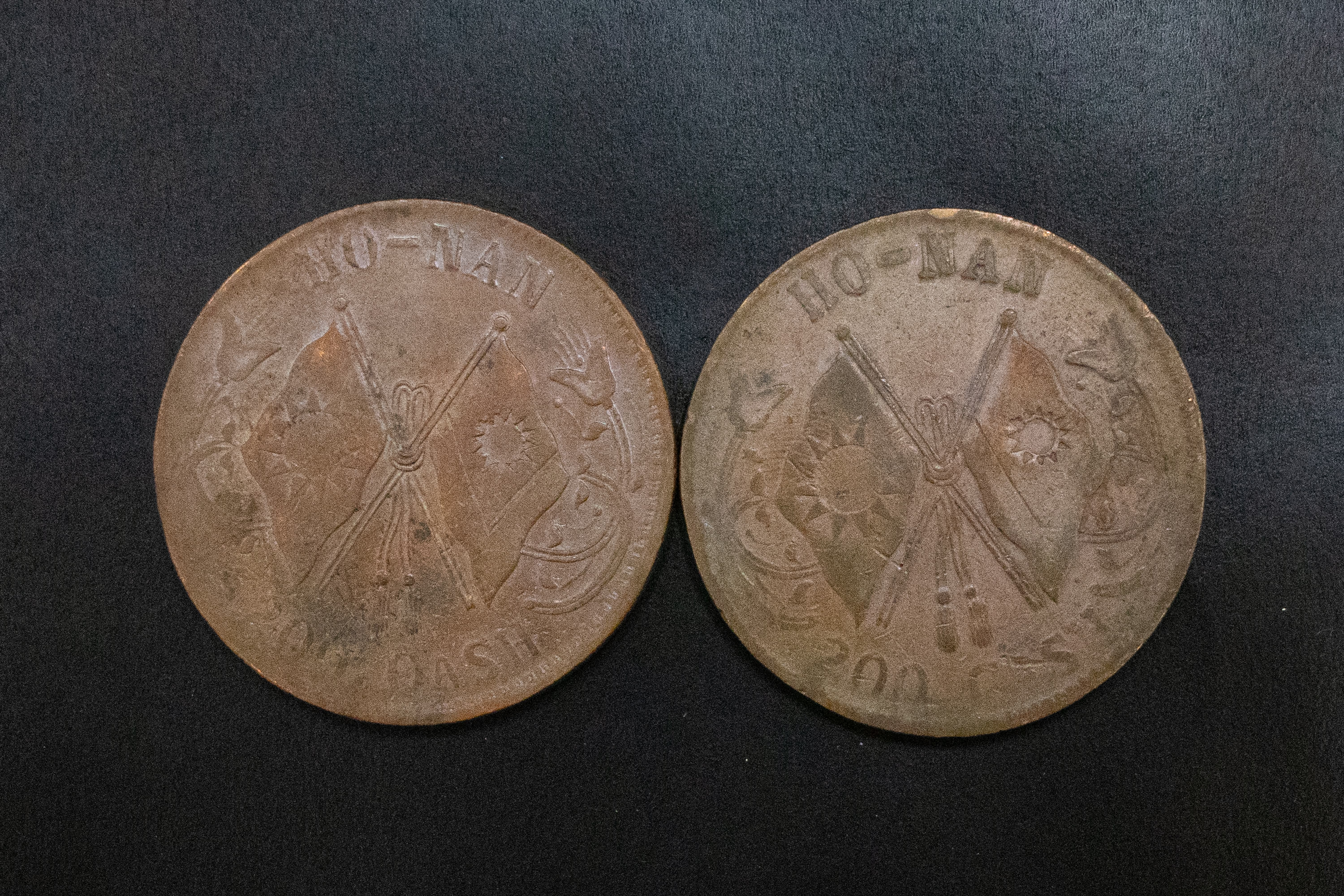 這兩枚銅幣,是民國時(shí)期錢幣的典型代表。幣面“HO-NAN”字樣與交叉雙旗(青天白日旗)紋飾,是民國初年政治變革的視覺印記,旗影獵獵間,仿佛能窺見那個(gè)時(shí)代的風(fēng)云激蕩;背面的花卉、嘉禾圖案,刻繪精細(xì),既含傳統(tǒng)紋飾的典雅,又具近代鑄幣的工藝質(zhì)感。它們的銅色古樸厚重,包漿自然醇熟,是時(shí)光親手打磨的勛章,每一處磨損都藏著市井的煙火,每一道痕跡都記著歷史的流轉(zhuǎn)。