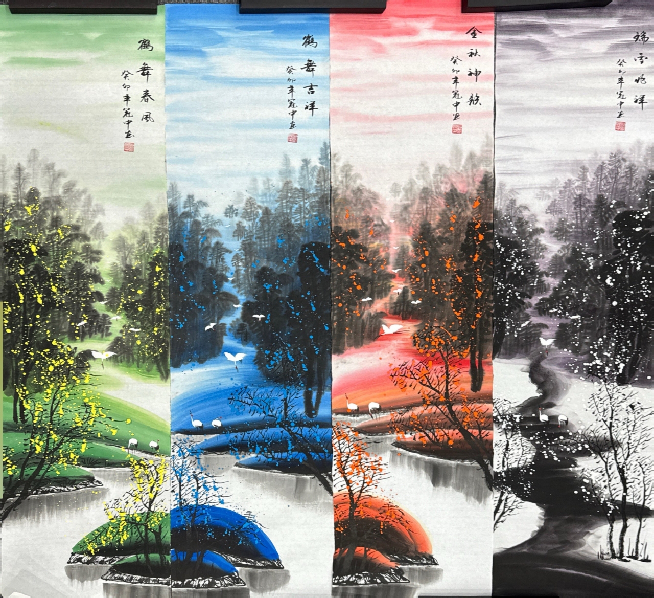 春之屏,嫩綠的新芽點綴枝頭,黃鶯在林間穿梭,輕盈的筆觸與清新的色調,仿佛將春日的蓬勃朝氣盡數展現,讓人嗅到泥土的芬芳與花朵的馥郁;夏之屏,濃墨重彩描繪出繁茂的樹林,湛藍的天空與碧綠的湖水相映成趣,白鷺悠然飛過,盡顯夏日的熱烈與生機;秋之屏,絢爛的紅與橙交織,似燃燒的火焰,將秋日山林的層林盡染之景刻畫得淋漓盡致,傳遞出豐收與成熟的喜悅;冬之屏,以簡潔的黑白灰為主調,寥寥幾筆勾勒出雪后的靜謐世界,卻蘊含著無盡的寧靜與悠遠,讓人感受到冬日的清冷卻又不失詩意。