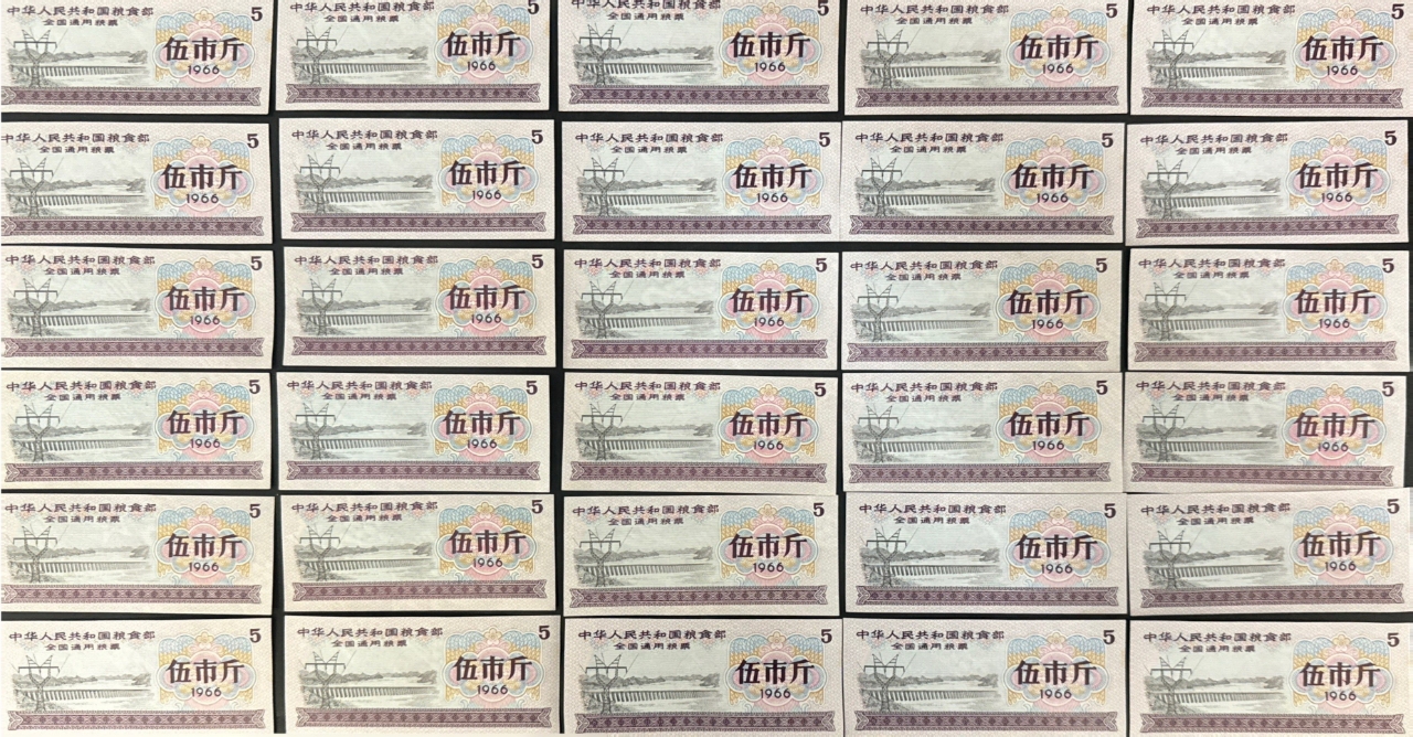 1966 年正值我國計劃經(jīng)濟(jì)時期糧食供應(yīng)體系的關(guān)鍵階段,彼時糧食按計劃分配,糧票成為 “吃飯的通行證”,覆蓋城鄉(xiāng)每一個家庭。這版伍市斤糧票在設(shè)計上頗具時代特色:票面上方印著 “中華人民共和國糧食部” 的莊重字樣,中間以醒目字體標(biāo)注 “伍市斤” 面額,兩側(cè)對稱的裝飾紋樣簡潔大氣,既符合當(dāng)時的審美風(fēng)格,更暗含 “民以食為天” 的社會底色。更特殊的是其水印設(shè)計 ——1966 年版全國通用糧票僅 3 市斤和 5 市斤面額使用水印紙,5 市斤面額又細(xì)分為 “實心五角星” 與 “空心五角星加麥穗” 兩種,其中 “空心五角星加麥穗” 版本因印制工藝更復(fù)雜、發(fā)行數(shù)量更少,存世量僅為 “實心五角星” 版本的三分之一,稀缺性不言而喻。