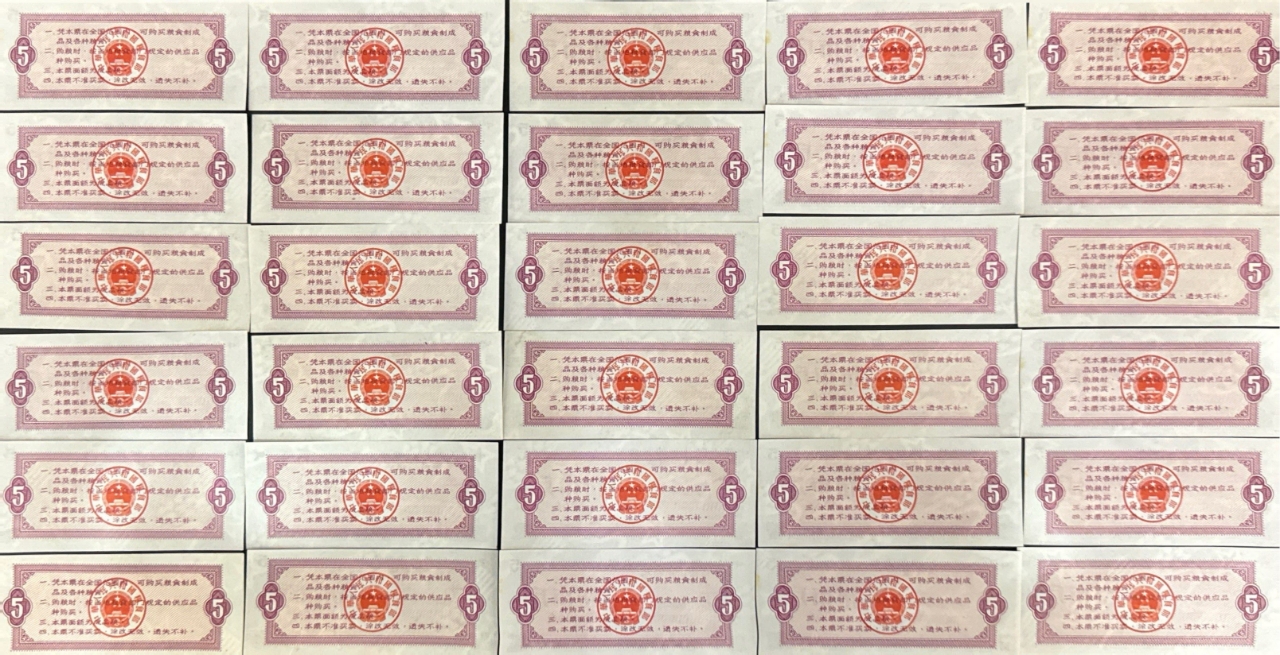 仔細(xì)觀察這套糧票,透過光線可清晰看到水印細(xì)節(jié):空心五角星輪廓規(guī)整、星芒舒展,下方環(huán)繞的麥穗顆粒分明、線條流暢,既象征著糧食豐收,也起到了重要的防偽作用,是當(dāng)時印鈔技術(shù)與糧食管理需求結(jié)合的典型體現(xiàn)。更難得的是,這套三十張糧票保存完好,票面呈自然的淡黃色,無明顯折損、污漬,水印圖案完整清晰,連票邊的裁切痕跡都保持著當(dāng)年的工整,品相上佳。在收藏界,“成套藏品價值遠(yuǎn)勝單張” 是共識,三十張同版本、同水印的糧票成套留存,不僅能更完整地呈現(xiàn)當(dāng)年的發(fā)行特征,其市場競爭力也遠(yuǎn)超單張票券。