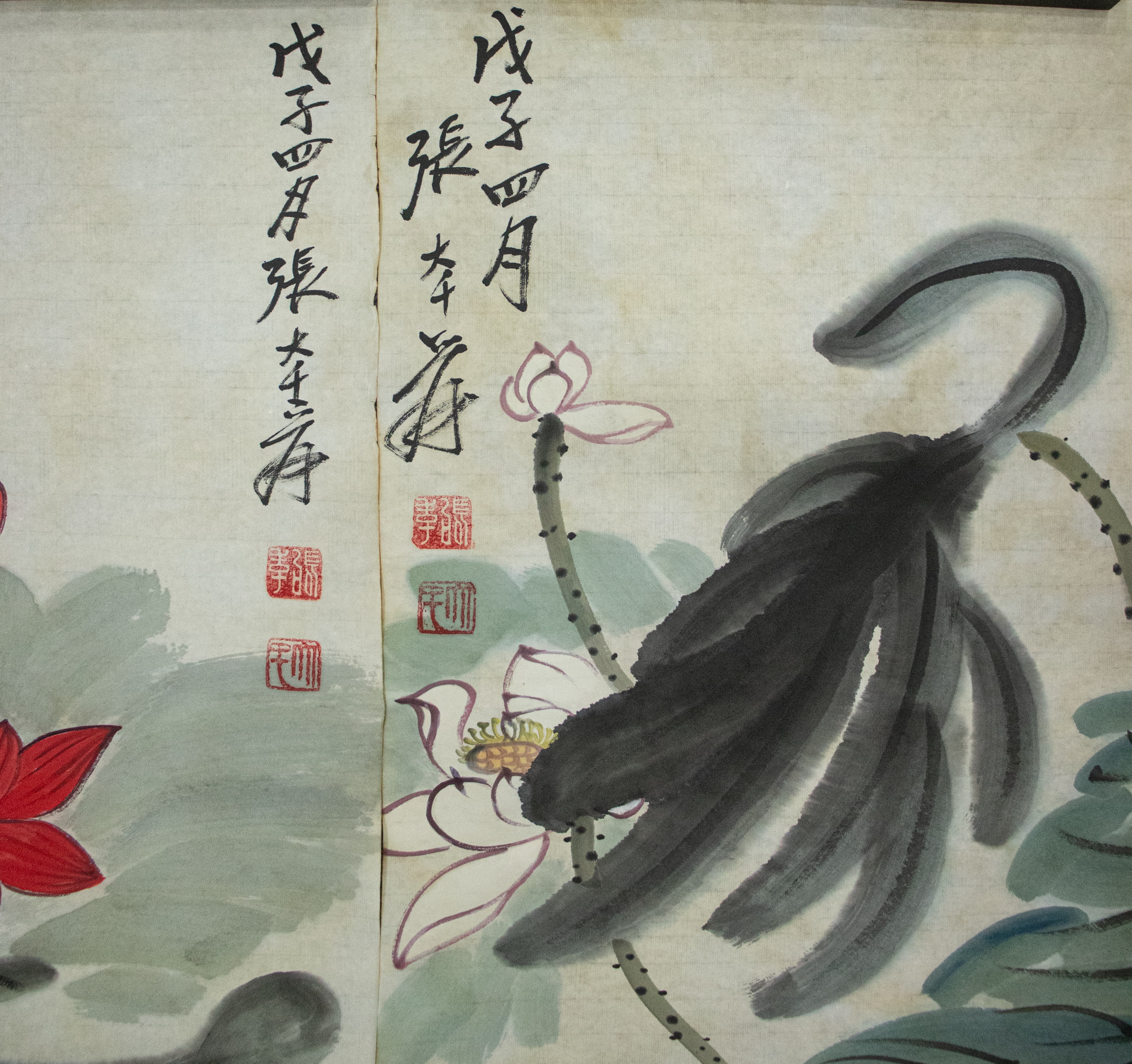 張大千是近現(xiàn)代畫壇橫跨傳統(tǒng)與現(xiàn)代、融合東方與西方的全能型大師,其荷花創(chuàng)作在花鳥畫領(lǐng)域具有里程碑意義。他早年精研傳統(tǒng)文人畫,中年游歷西方吸收現(xiàn)代藝術(shù)養(yǎng)分,晚年開創(chuàng)潑彩技法,而這幅創(chuàng)作于戊子年(1948年)的荷花四條屏,正處于其藝術(shù)風(fēng)格成熟的關(guān)鍵期——既保留了傳統(tǒng)文人畫的筆墨雅致,又暗含對現(xiàn)代審美意趣的探索,是研究張大千藝術(shù)風(fēng)格演變的核心實物資料。