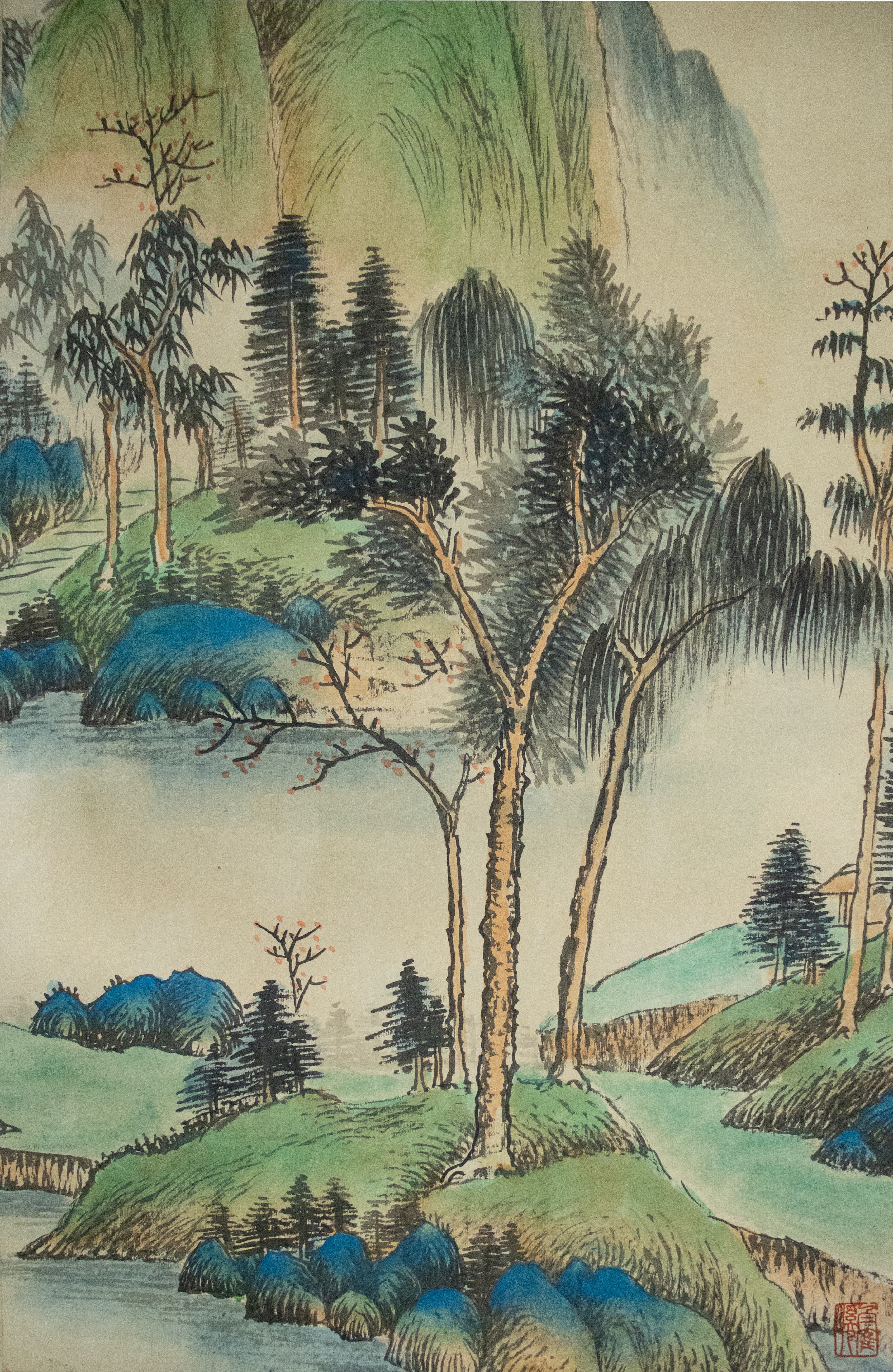 畫面以石青、石綠為主調(diào),層次豐富且過渡自然。山巒的青綠暈染既見“青綠山水”的華貴,又無俗艷之氣;樹木、坡石的色彩搭配和諧雅致,將“山為碧玉簪,水為青羅帶”的詩意視覺化,盡顯江南山水的靈秀與桂林山水的奇絕。山石以細膩的皴法勾勒,既有元代山水的蒼潤,又含宋代院體的工整;樹木的枝干、樹葉勾勒一絲不茍,松針、柳葉的細節(jié)極具表現(xiàn)力,卻又不失整體氣韻的靈動,完美詮釋了“工而不板,細而不膩”的筆墨境界。