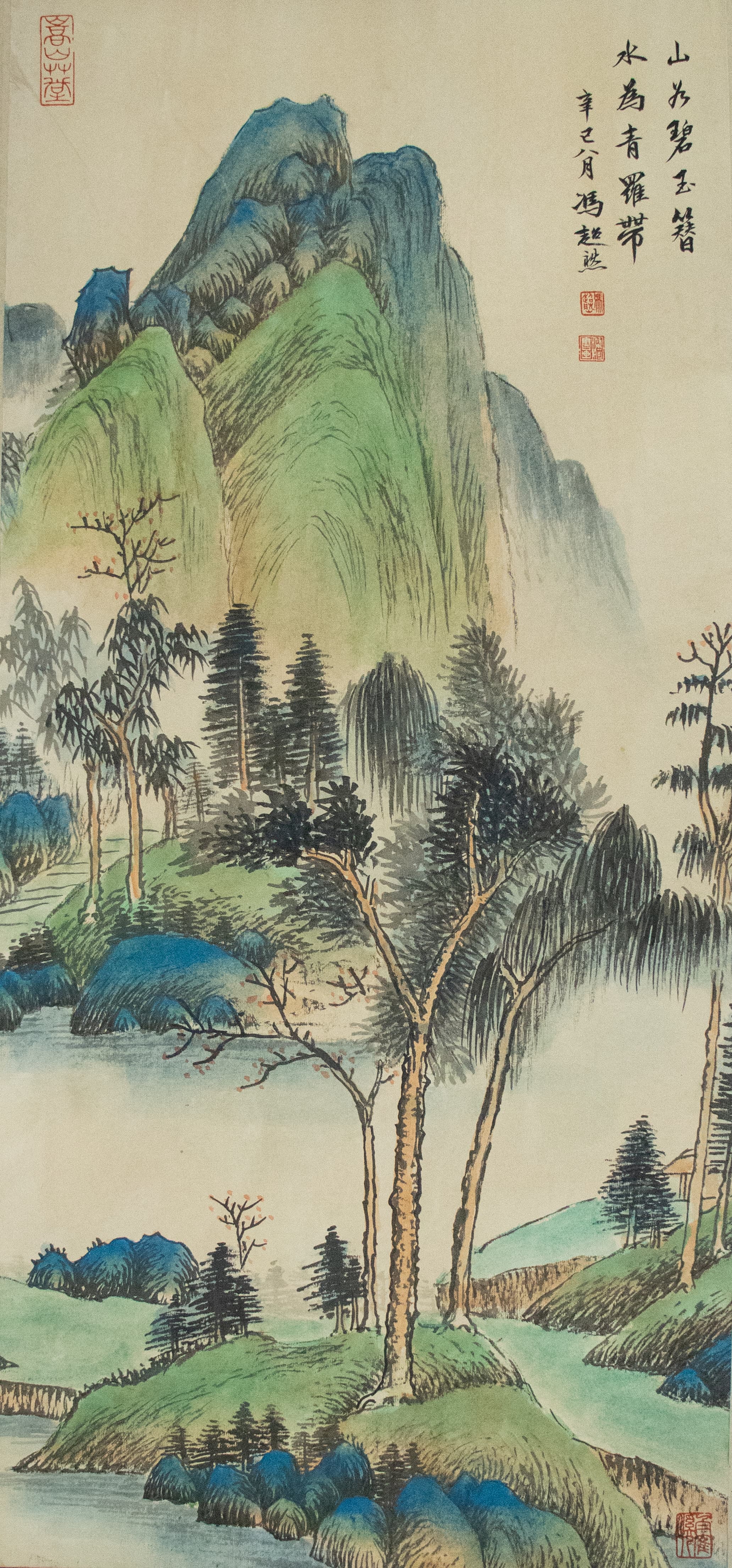 馮超然,作為民國“三吳一馮”畫壇陣營的核心人物,以精湛的仿古山水技法與文人畫底蘊,成為傳統(tǒng)山水畫在近現(xiàn)代傳承的關(guān)鍵紐帶。馮超然位列“三吳一馮”(吳湖帆、吳待秋、吳華源、馮超然),是民國畫壇傳統(tǒng)山水畫的堅定守護者與創(chuàng)新者。他精研宋元諸家,尤擅青綠山水與工筆人物,其作品既具傳統(tǒng)筆墨的嚴謹法度,又含文人畫的雅致氣韻,是研究民國時期“仿古山水現(xiàn)代化”的典型樣本。這幅作品款識“辛巳月馮超然”,創(chuàng)作于其藝術(shù)成熟期,是其青綠山水風格的集中體現(xiàn)。