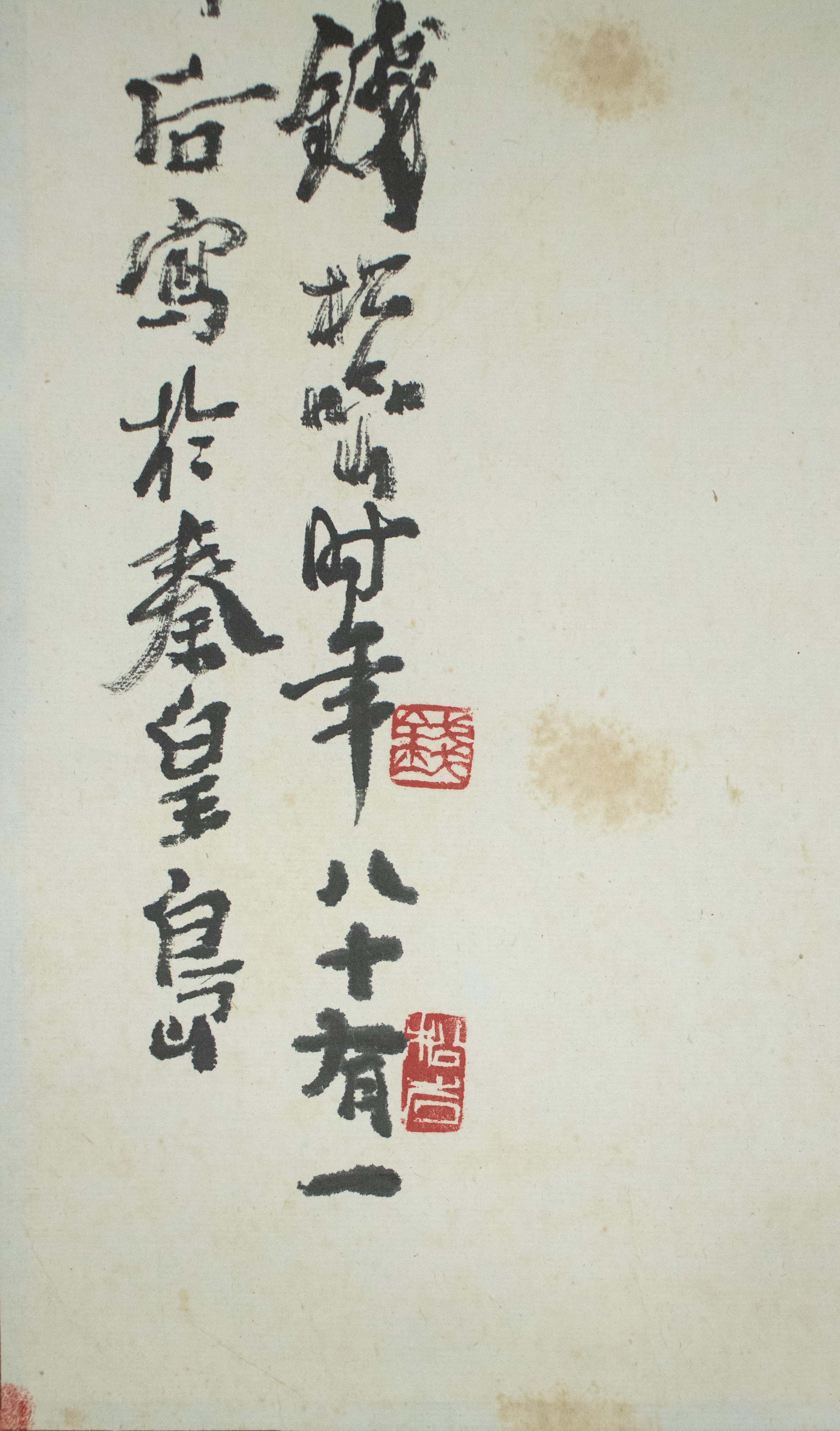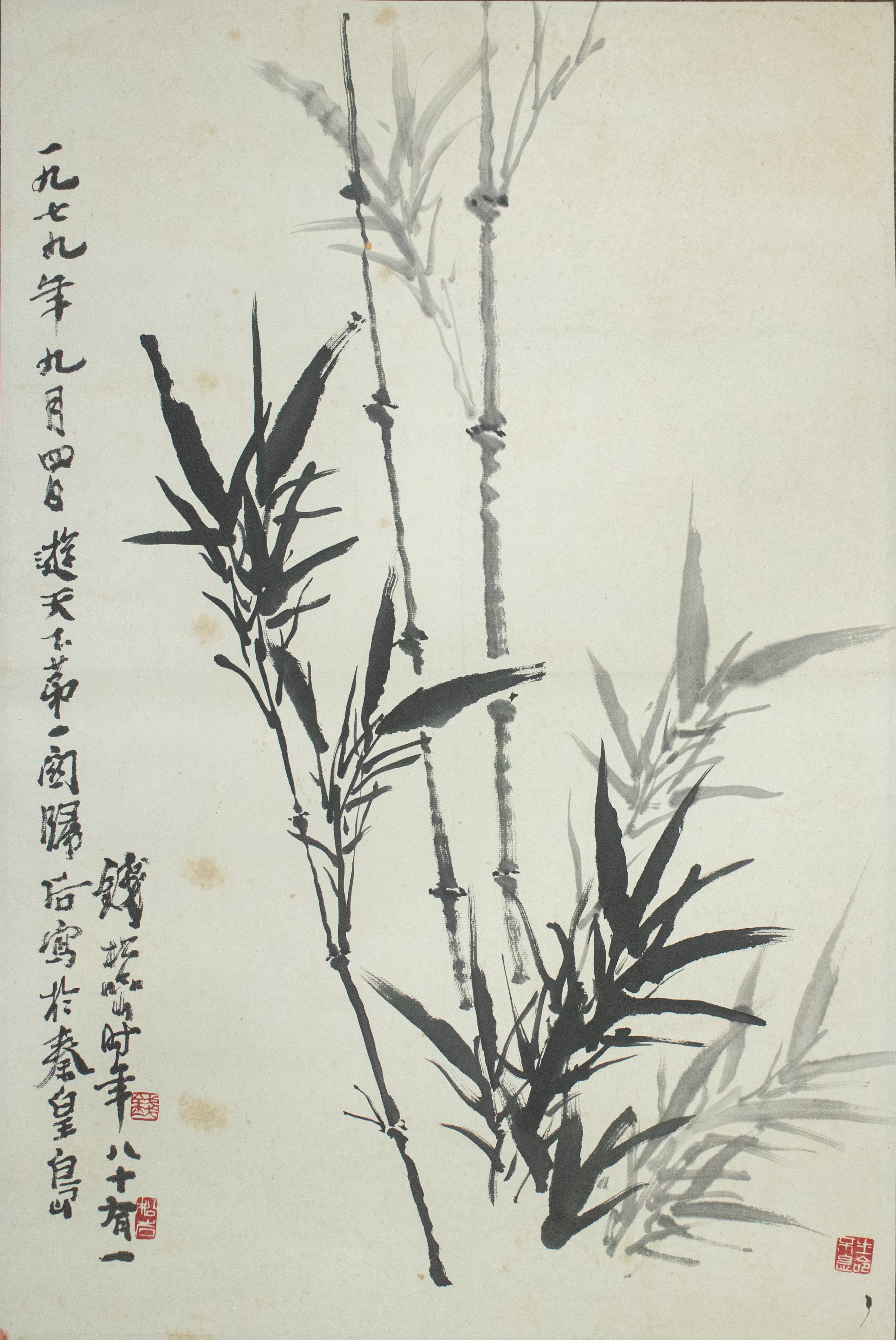 題款與印章的布局更是點(diǎn)睛之筆?!板X松喦時(shí)年八十有一,后寫于秦皇島”的題字,筆力蒼勁老辣,與墨竹的風(fēng)骨相得益彰,既點(diǎn)明了創(chuàng)作背景與作者心境,又在視覺上與竹影形成呼應(yīng),讓書畫融為一體。兩方朱印紅得熱烈,在素凈的宣紙上格外醒目,既平衡了畫面的墨色比重,又添了幾分古樸雅致的金石氣息。