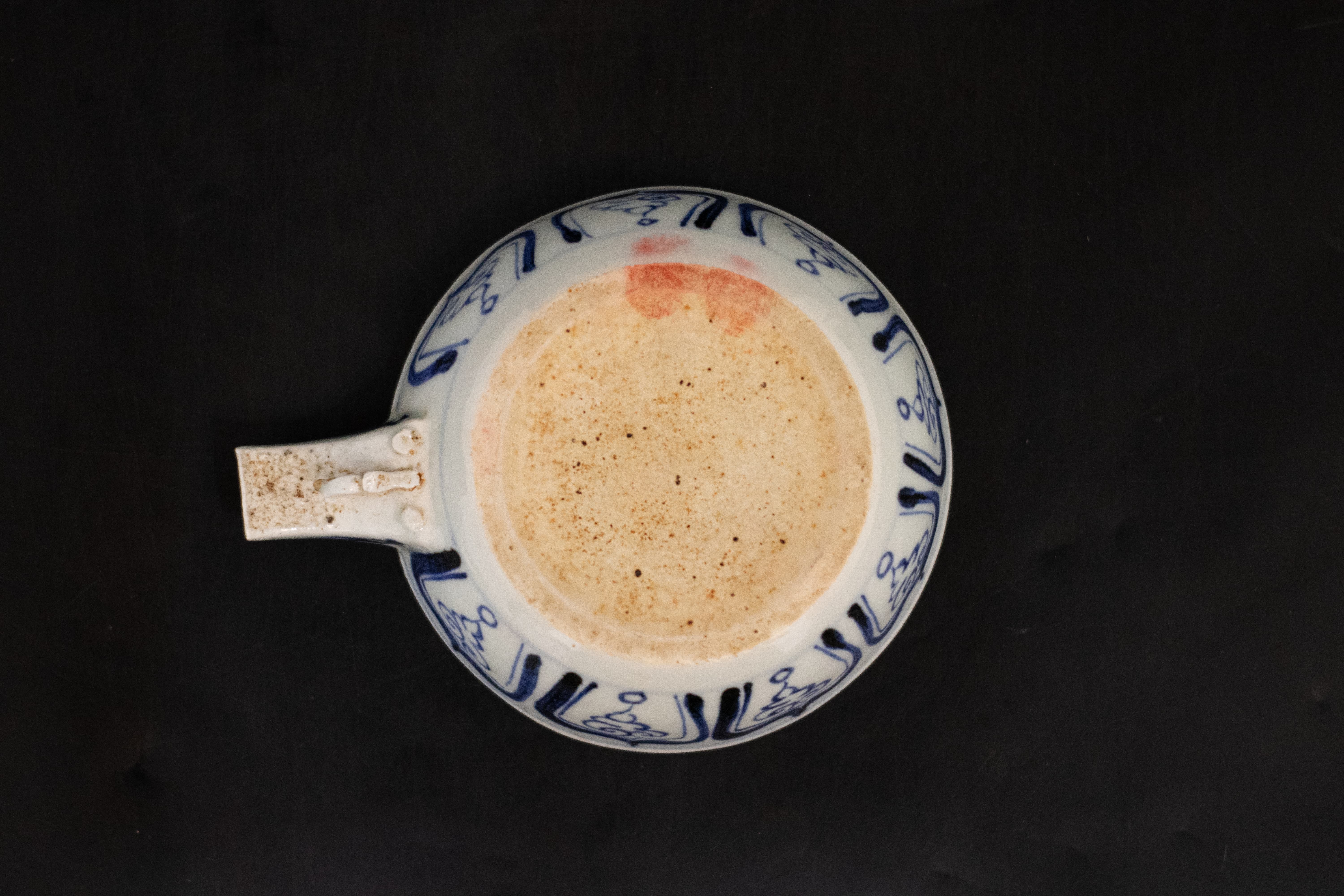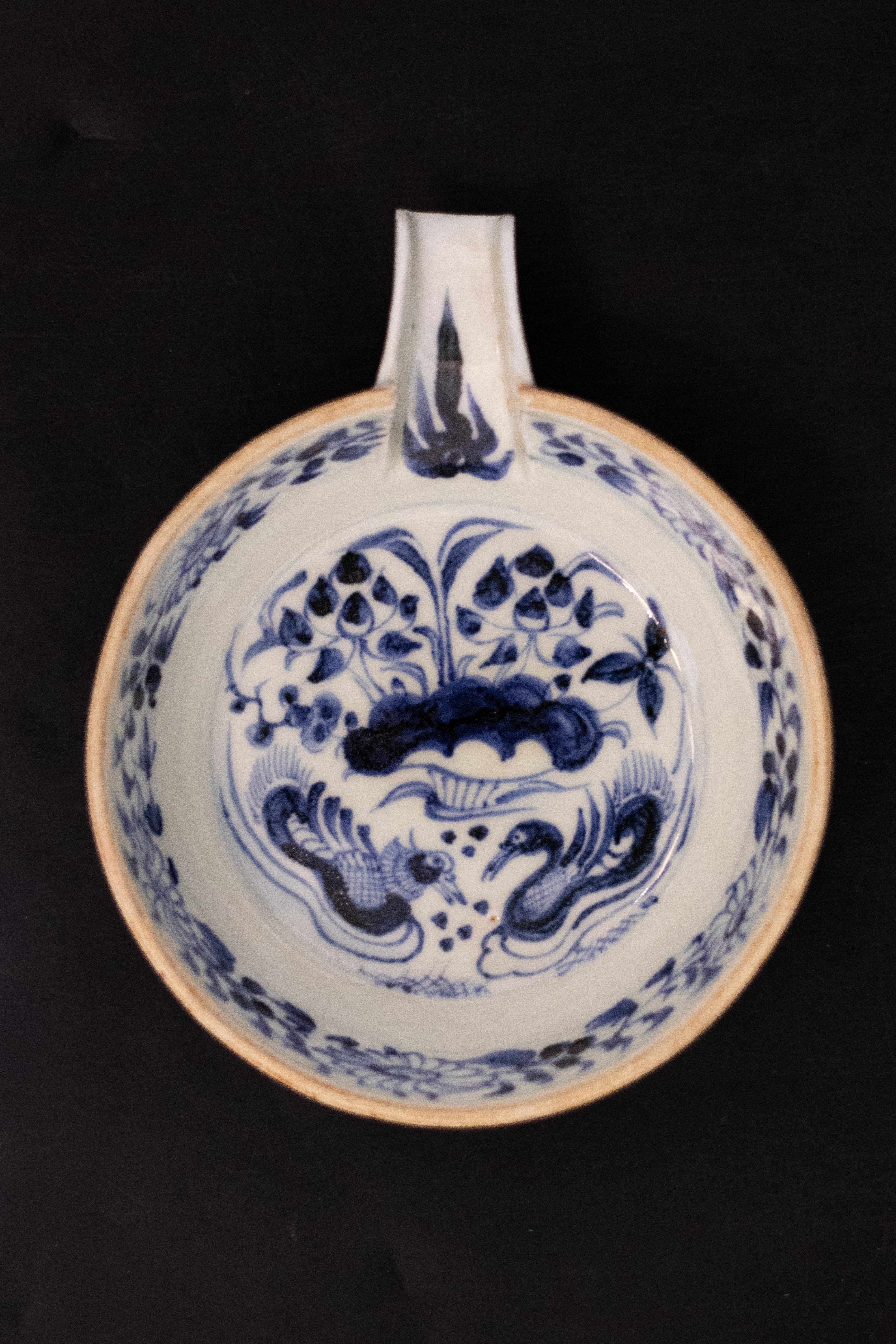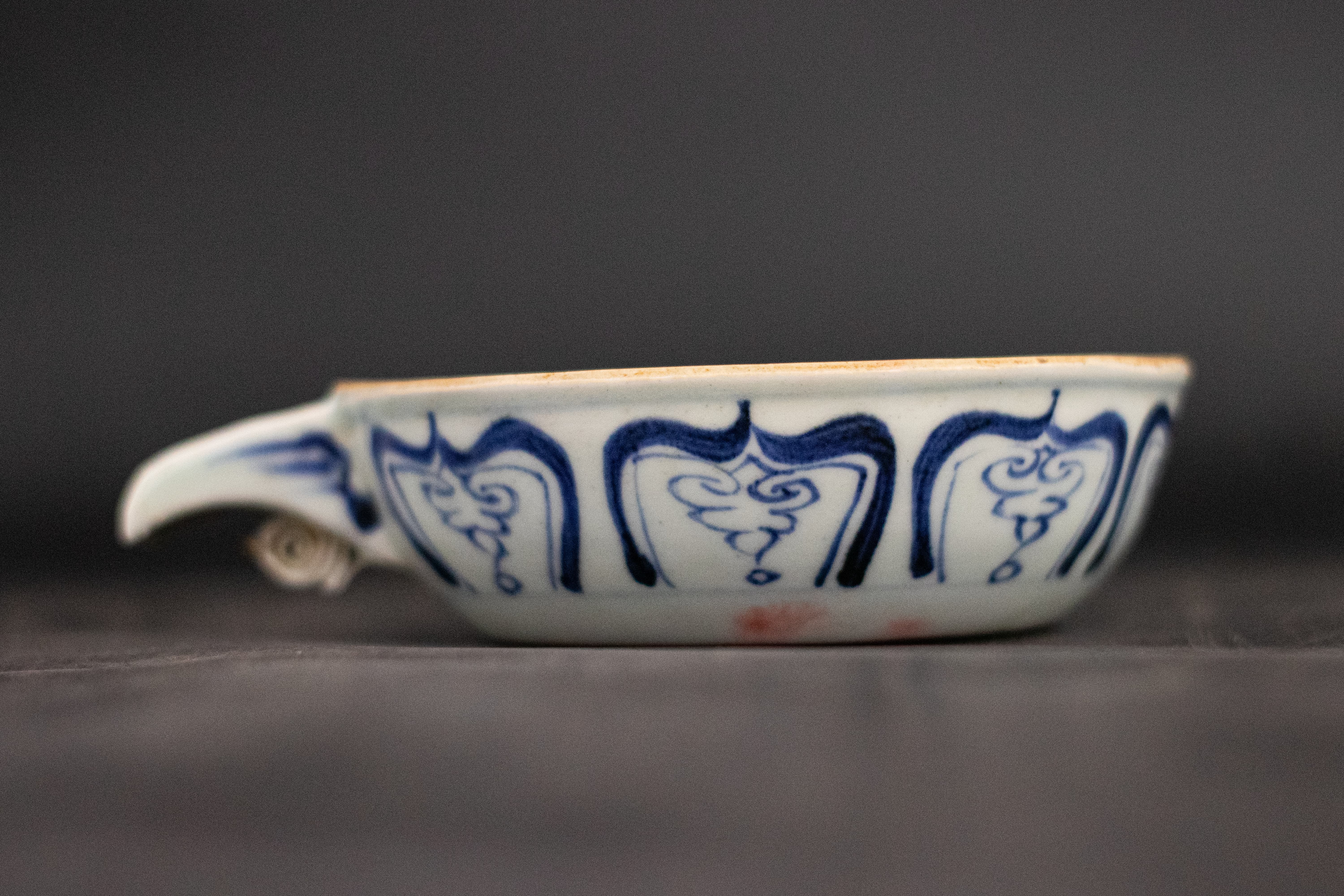 它的造型別具一格,那流暢的弧形器身,搭配一側(cè)造型精巧的鋬(pàn)柄,既方便握持,又在視覺(jué)上形成了優(yōu)美的線條韻律。器身的青花裝飾更是精彩絕倫,以濃淡相宜的青花料繪就了多層紋飾。內(nèi)壁主體是蓮池鴛鴦紋,一汪碧池之上,荷花或含苞、或綻放,荷葉田田,一對(duì)鴛鴦在水中嬉戲,神態(tài)生動(dòng),似在私語(yǔ),將自然的生機(jī)與溫情融入瓷間;外圍的輔助紋飾繁而不亂,纏枝花卉蜿蜒舒展,與主體紋飾相得益彰,共同構(gòu)筑出層次豐富的視覺(jué)盛宴。外壁則飾有蕉葉紋,葉片輪廓清晰,葉脈刻畫(huà)細(xì)致,青花的濃淡變化讓葉片更具立體感,仿佛微風(fēng)拂過(guò),蕉葉便會(huì)輕輕搖曳。