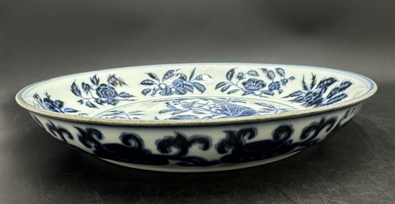 器物的核心裝飾采用典型的“蘇麻離青”鈷料繪制,雙鸚鵡銜金桃的主題圖案生動傳神,鸚鵡羽毛層次分明,金桃飽滿圓潤,搭配環(huán)繞盤壁的四季花卉和圈足海水紋,形成疏密得當(dāng)?shù)募榧y飾體系。青花發(fā)色濃艷深沉,局部鈷料堆積形成的鐵銹斑痕,正是宣德青花的標(biāo)志性特征。紋飾線條流暢有力,分水技法精湛,濃淡層次自然過渡,展現(xiàn)出御窯畫師的高超技藝。