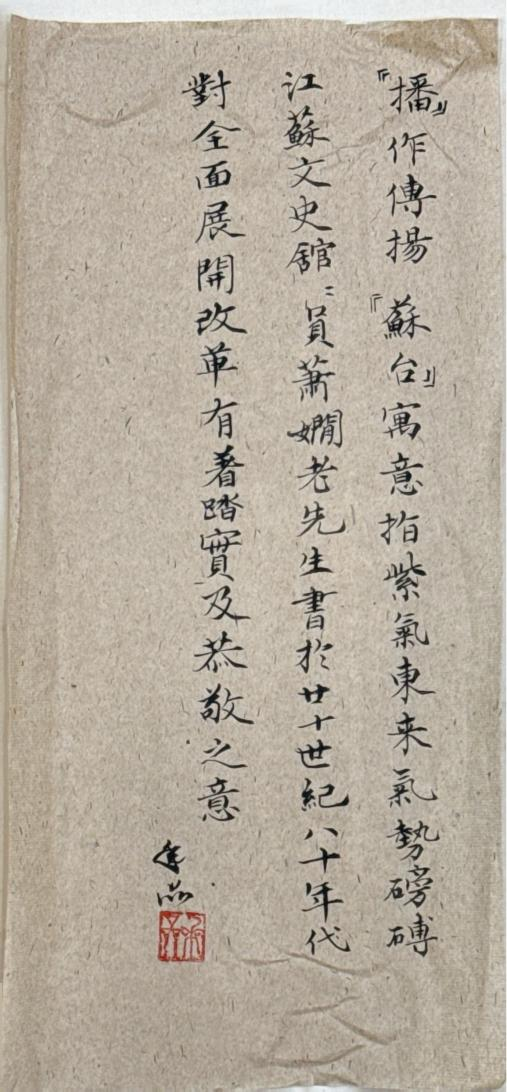 作品書于20世紀80年代,正值改革開放初期。題跋中“紫氣東來,氣勢磅礴”的注解,暗合“蘇臺”(江蘇)地區(qū)的文化復興意象。作為江蘇文史館員,蕭嫻以筆墨寄寓對家鄉(xiāng)發(fā)展的期許:“播”字暗含文化傳揚之意,“蘇臺”則象征江南文脈的覺醒,成為特殊歷史時期的精神縮影。
