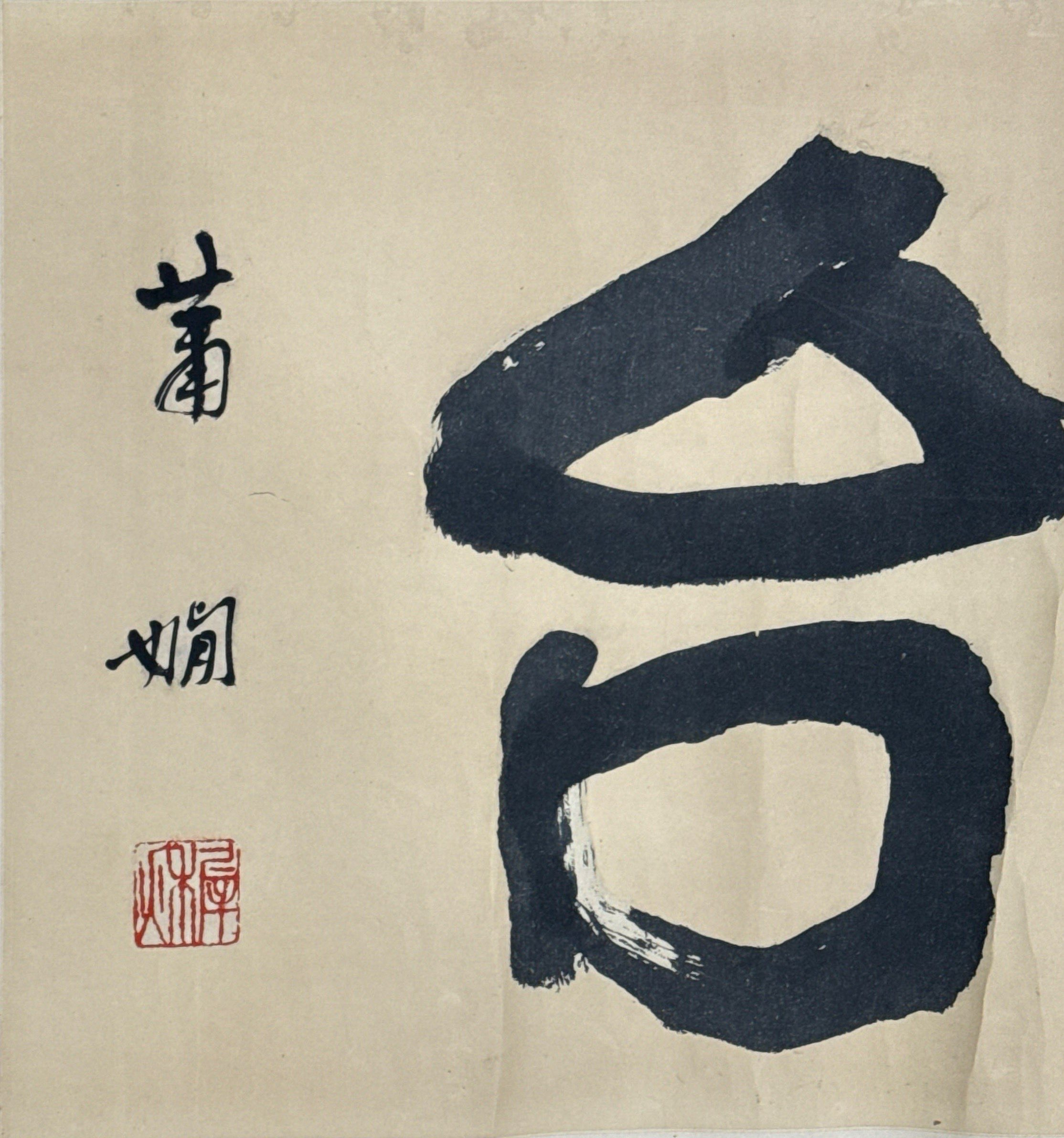 這幅《播蘇臺》三字橫幅,是蕭嫻藝術成熟期的代表作,盡顯其“以碑為骨、以帖為魂”的創(chuàng)作理念?!安ァ弊肿笫沼曳牛┕P豎畫如懸針,力道千鈞;“蘇”字草頭與“魚”“禾”結構緊密,筆畫如篆隸般盤曲,盡顯金石韻味;“臺”字上半取金文“厶”形,下半“口”部夸張外擴,宛如摩崖石刻的雄渾氣象,視覺沖擊力強烈。宿墨運用精妙,濃處如漆,淡處見飛白,營造出“干裂秋風,潤含春雨”的張力。