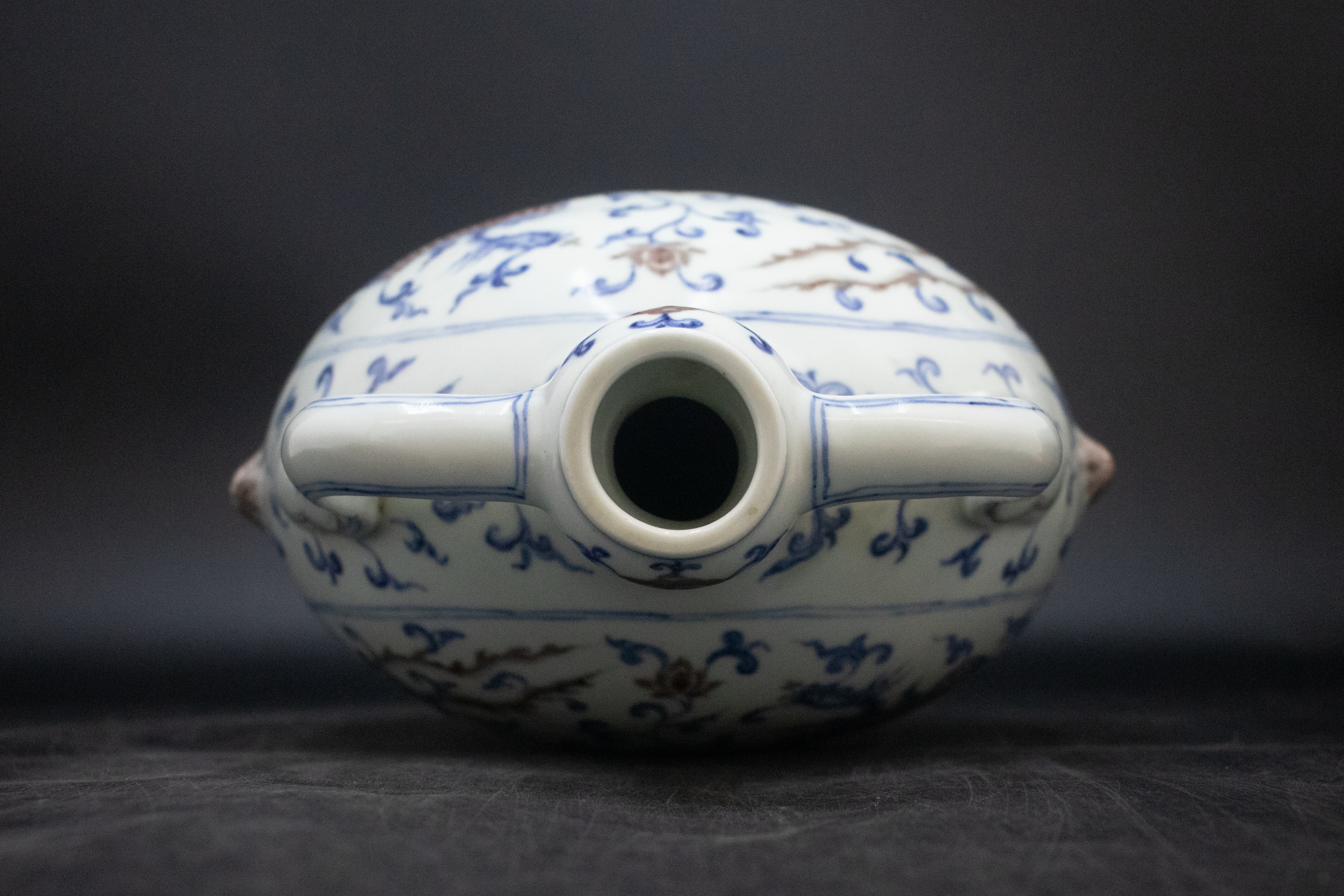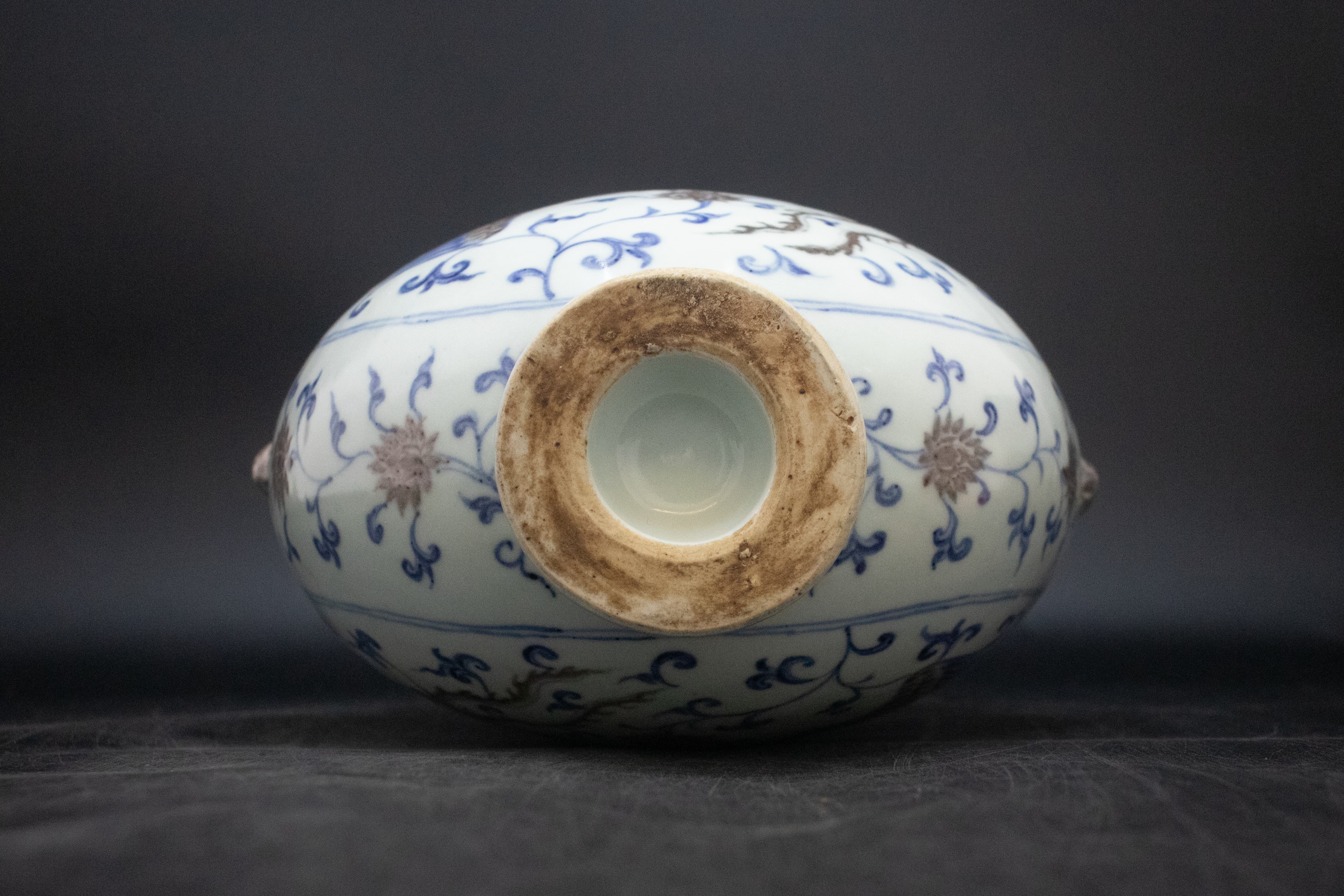 釉里紅以銅為呈色劑,對(duì)窯溫要求極為苛刻。此瓶的釉里紅發(fā)色醇厚溫潤(rùn),紅中帶褐的色澤均勻雅致,與青花的幽藍(lán)形成“冷暖相濟(jì)”的視覺(jué)張力,盡顯宣德窯工對(duì)窯溫控制的登峰造極之術(shù)。