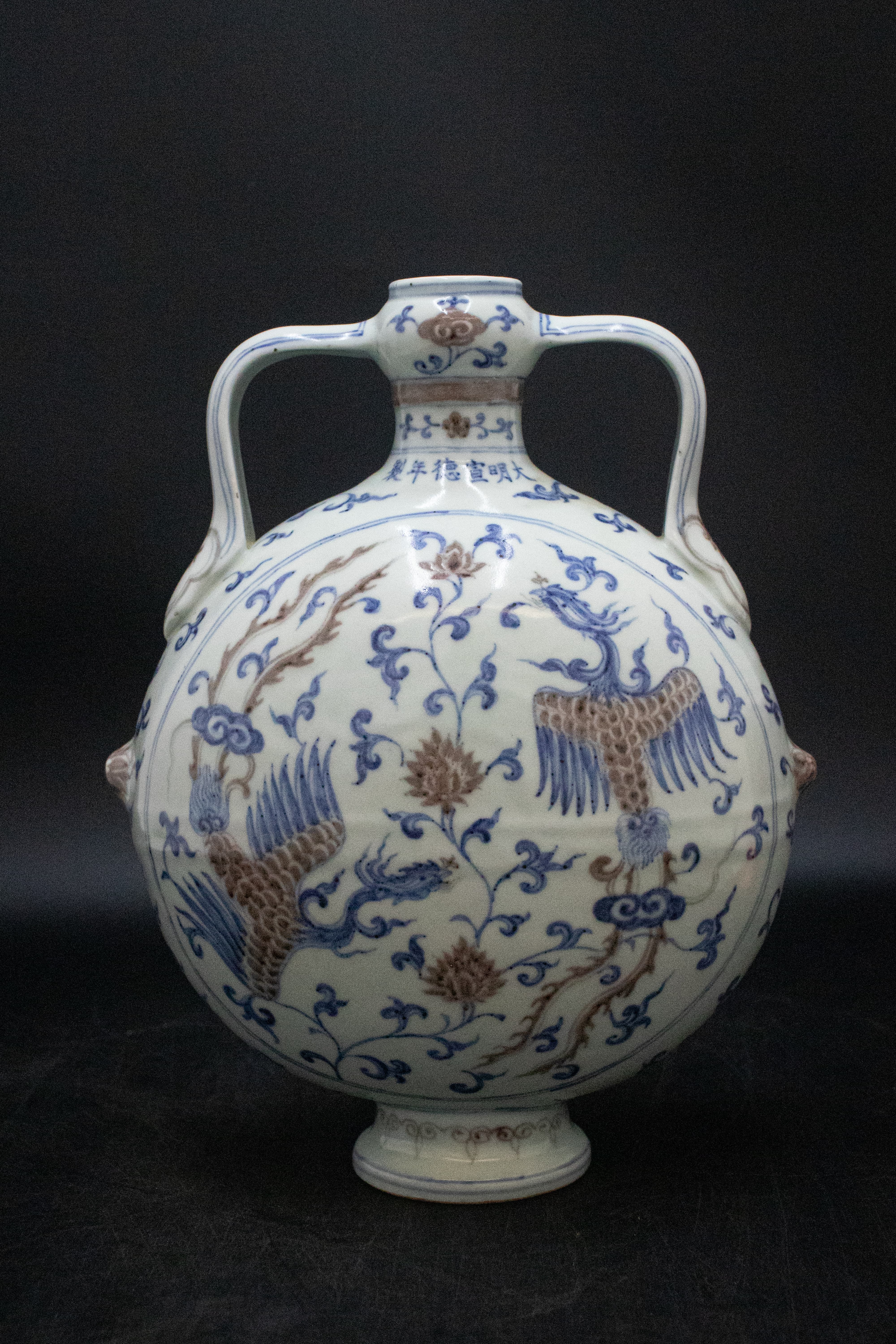 鳳凰是古代皇權(quán)的“瑞獸”,與龍紋并稱“龍鳳呈祥”。瓶身的雙鳳姿態(tài)矯健,羽毛以釉里紅與青花分層描繪,鱗片清晰、神態(tài)威嚴(yán),既體現(xiàn)了宣德時(shí)期對(duì)“瑞獸”形象的寫實(shí)追求,又暗含“皇權(quán)永固”的政治隱喻。鳳紋與纏枝蓮的布局疏密有致,青花勾勒輪廓,釉里紅填充細(xì)節(jié),兩者交織出立體的視覺(jué)層次。每一朵花瓣、每一根羽毛的線條都筆意流暢,盡顯宣德官窯畫師的精湛技藝,是明代宮廷繪畫與陶瓷裝飾融合的典范。