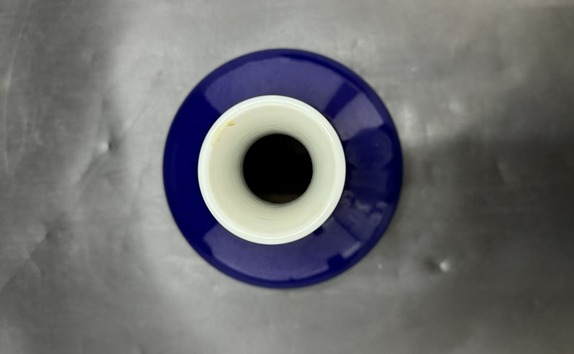 瓶口與圈足的“燈草邊”白釉,與霽藍(lán)主釉形成鮮明層次,盡顯御窯匠人對(duì)細(xì)節(jié)的極致把控。其采用的霽藍(lán)釉屬高溫石灰堿釉體系,以進(jìn)口鈷料為呈色劑,經(jīng)1280℃以上高溫一次燒成。釉層厚達(dá)1.5-2毫米,釉面勻凈如凝脂,色階從深藍(lán)到幽紫過(guò)渡自然,顯微鏡下可見(jiàn)均勻分布的氣泡群與細(xì)微“橘皮紋”,這是乾隆御窯霽藍(lán)釉工藝成熟度的直接體現(xiàn)器型設(shè)計(jì)上,荸薺瓶脫胎于宋元瓷塑仿生傳統(tǒng),乾隆朝將其定型為“長(zhǎng)頸鼓腹,圈足微撇”的經(jīng)典制式,此件器物比例精準(zhǔn),頸腹銜接處線條弧度過(guò)渡自然,胎體修胎規(guī)整,足墻直立,盡顯官窯“重器不重形,重形更重工”的制器理念。