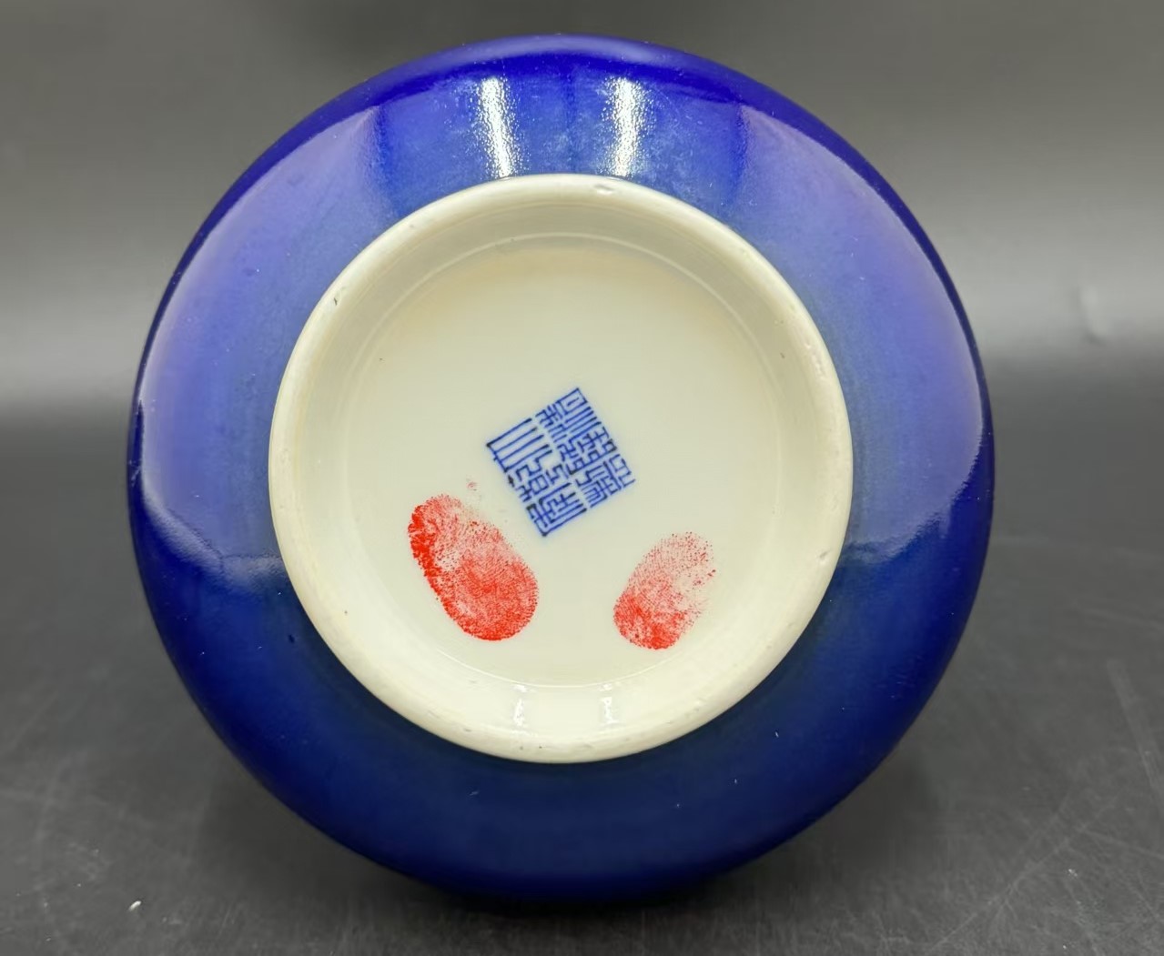 據(jù)《清宮造辦處檔案》記載,此類霽藍(lán)釉荸薺瓶多用于養(yǎng)心殿東暖閣陳設(shè),是乾隆帝“文房清供”體系中的核心器物之一。底部“大清乾隆年制”六字篆書(shū)款,結(jié)體方正,筆畫(huà)勻凈,布局居中,與北京故宮藏乾隆霽藍(lán)釉標(biāo)準(zhǔn)器款識(shí)完全吻合,是官窯款識(shí)“官樣化”生產(chǎn)的典型標(biāo)本。品相上,全器釉面無(wú)棕眼、無(wú)縮釉,口沿“燈草邊”白釉完整,圈足露胎處可見(jiàn)糯米胎特有的細(xì)膩質(zhì)感與自然老化火石紅,屬傳世品中難得的“全品”等級(jí)。在學(xué)術(shù)與市場(chǎng)領(lǐng)域,它既是研究清代顏色釉工藝從“模仿”到“創(chuàng)新”的關(guān)鍵實(shí)物資料,也是收藏市場(chǎng)“官窯單色釉”板塊的硬通貨。