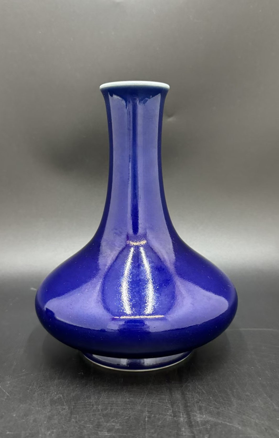 作為清代乾隆朝官窯顏色釉瓷的典范之作,此件霽藍(lán)釉荸薺瓶在陶瓷史與收藏界具有不可撼動(dòng)的專業(yè)地位。釉色是其靈魂絕唱。采用皇家專屬的霽藍(lán)釉工藝,以進(jìn)口鈷料經(jīng)高溫一次燒成,釉面如深海寶石般濃艷純凈,光澤溫潤(rùn)似玉,在光線下泛著幽邃的流光,所謂“霽藍(lán)一色,釉壓群芳”,正是對(duì)此器最精準(zhǔn)的注解。
