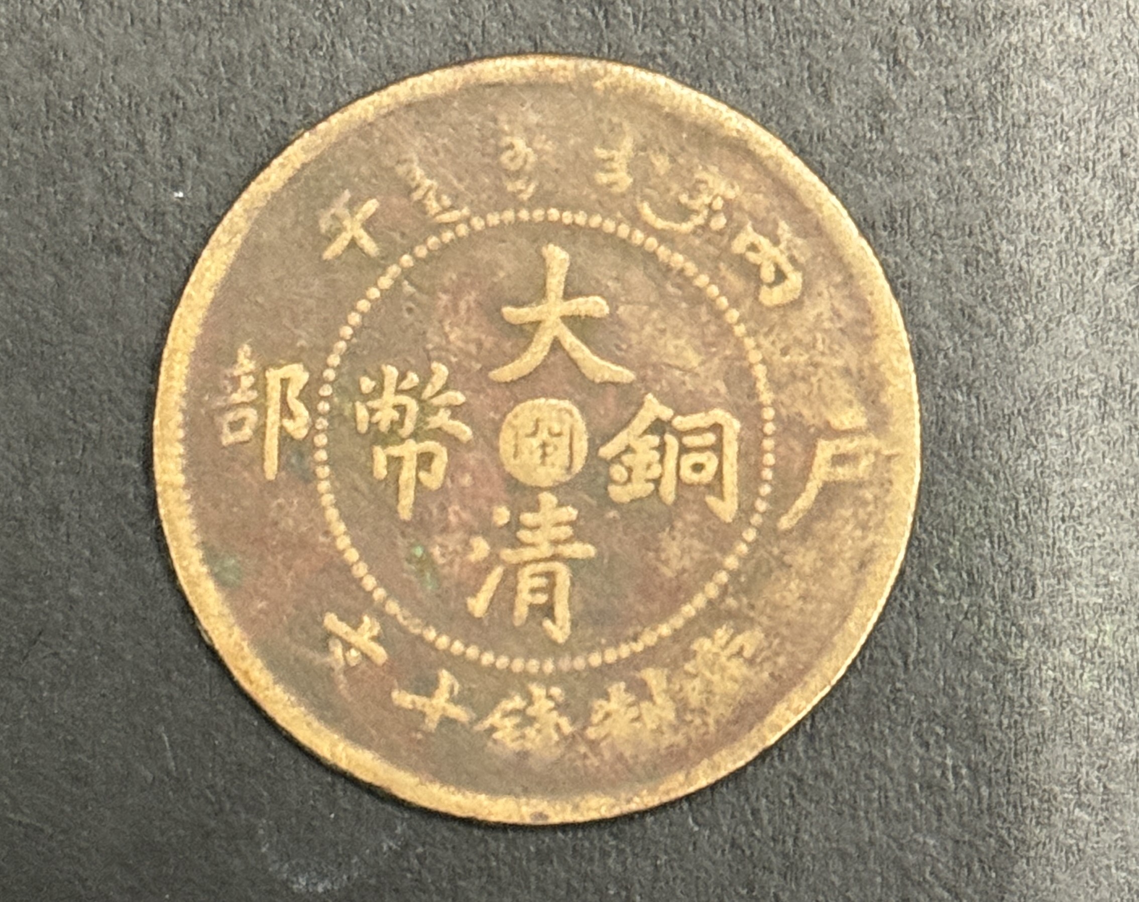 中央“大清銅幣”四字雄渾大氣,中心“閩”字戳記明確其福建鑄地身份,外環(huán)滿文與“戶部”字樣彰顯中央造幣權(quán)威,下緣“當(dāng)制錢十文”標(biāo)注幣值,整體設(shè)計(jì)既承載傳統(tǒng)鑄幣文化,又烙刻近代機(jī)制幣的工藝特征,是清末戶部統(tǒng)一幣制政策的實(shí)物佐證。