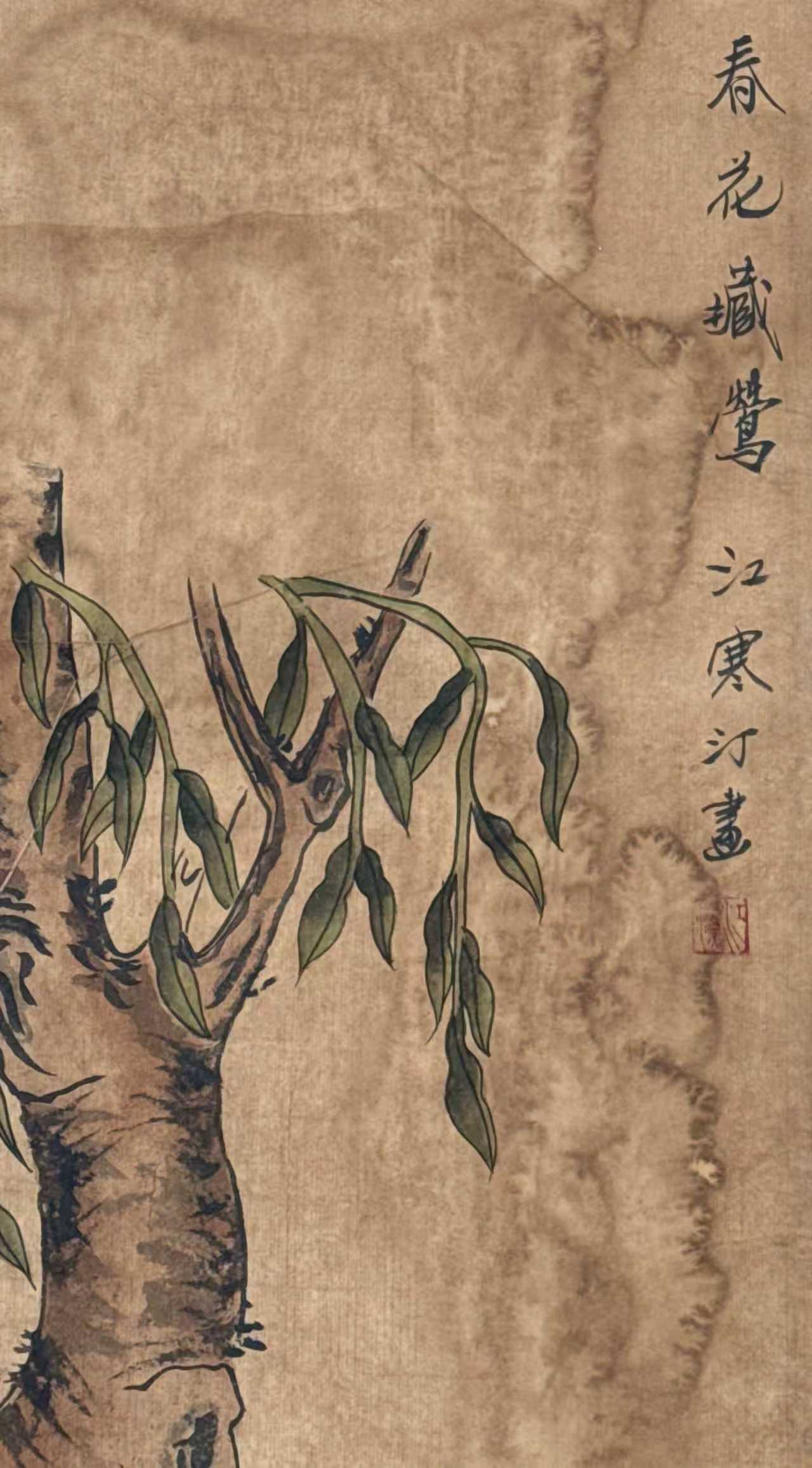 在藝術(shù)的璀璨星河中,江寒汀的名字熠熠生輝,他以卓越的筆墨才情,為中國(guó)花鳥(niǎo)畫(huà)史添上了濃墨重彩的一筆。畫(huà)面中,江寒汀以細(xì)膩筆觸勾勒出春日的生機(jī)盎然。柳枝低垂,細(xì)長(zhǎng)的葉片在微風(fēng)中似有若無(wú)地?fù)u曳,墨色的枝干紋理清晰,盡顯歲月滄桑與生命堅(jiān)韌。嬌艷的牡丹肆意綻放,粉蕊紅瓣層層疊疊,搭配上清新的綠葉,色彩對(duì)比鮮明卻又和諧相融,將牡丹的富貴之姿展現(xiàn)得淋漓盡致。