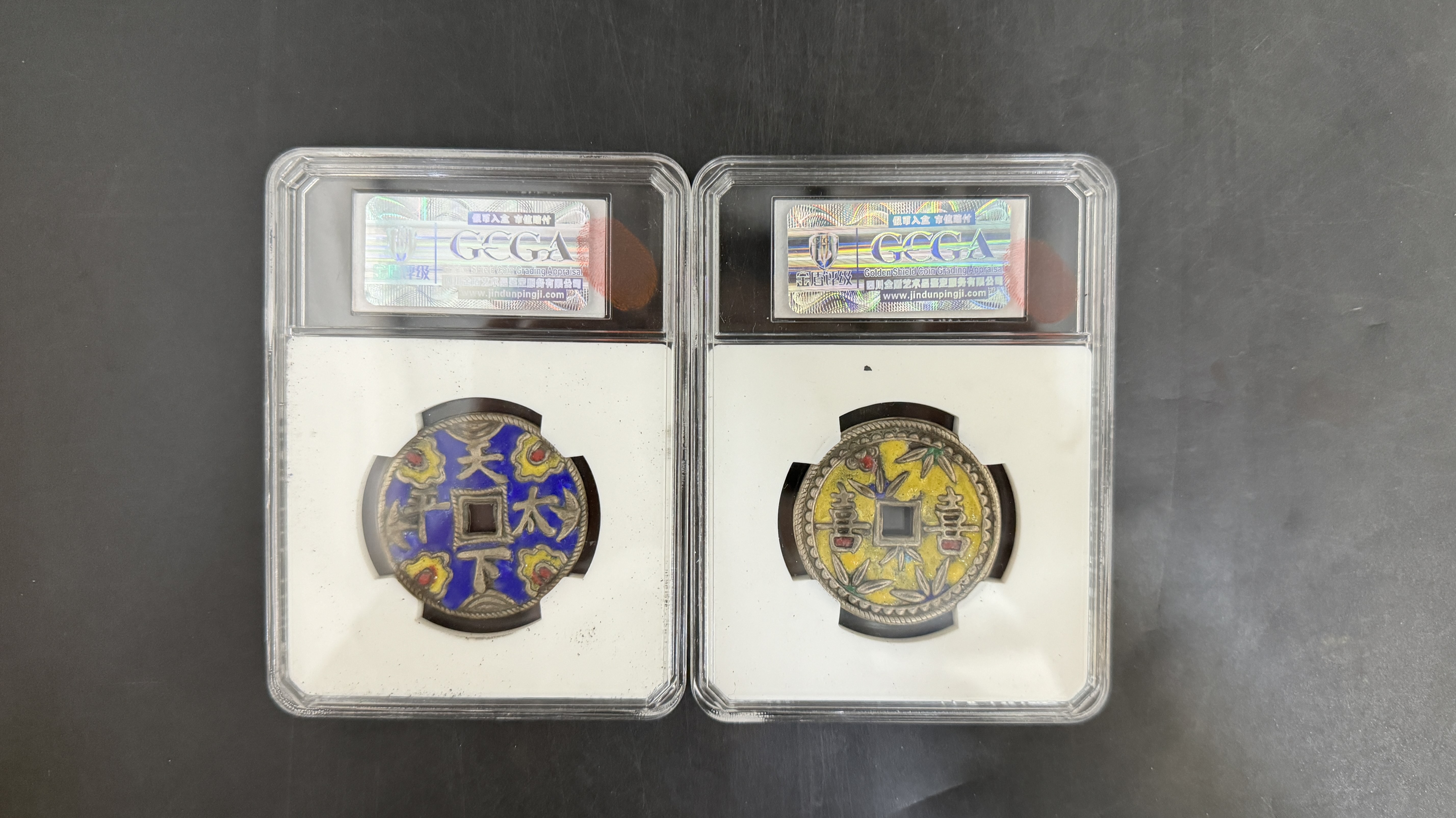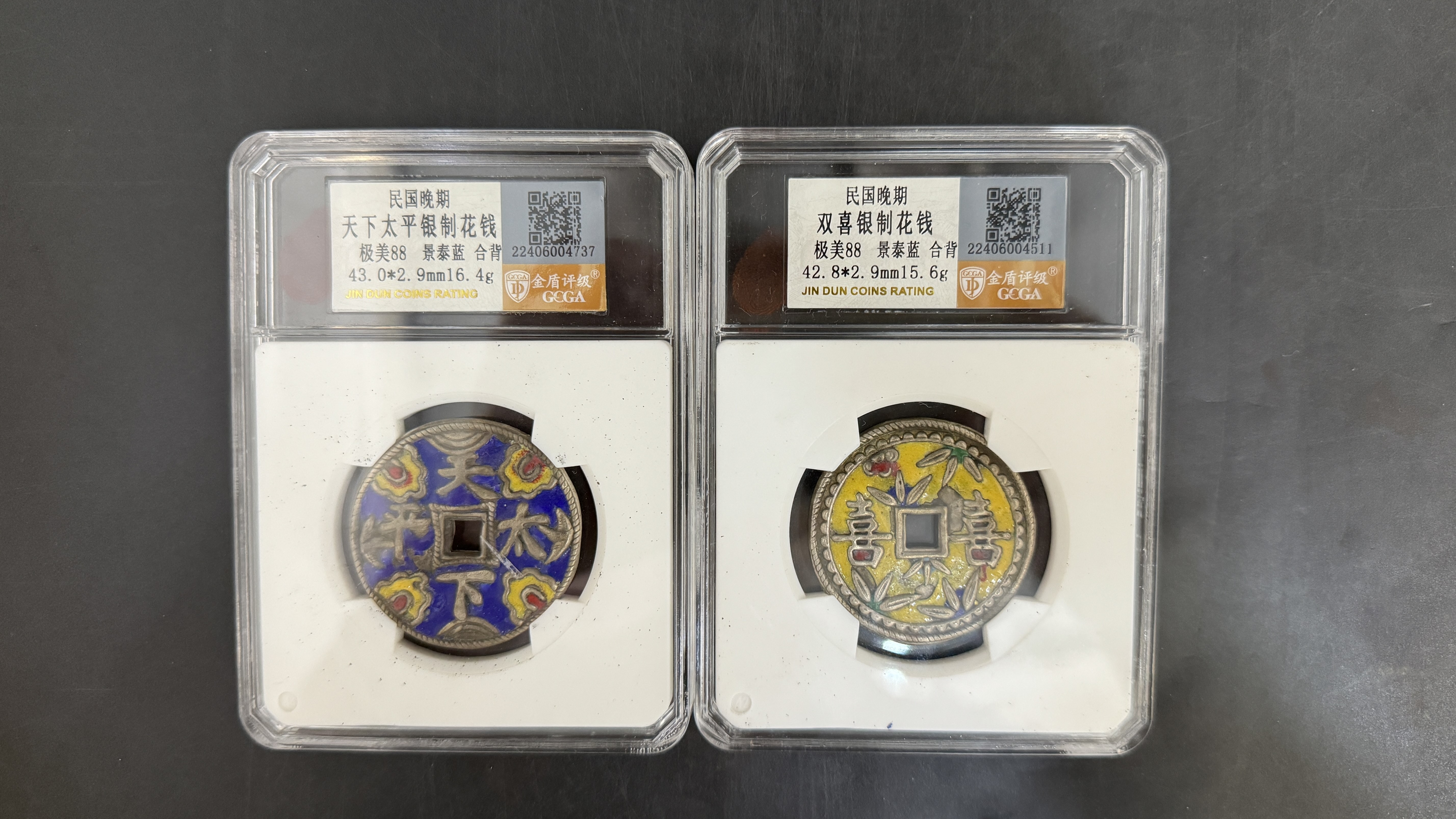 當(dāng)民國工藝的精工巧思邂逅傳統(tǒng)吉語的文化基因,這組民國晚期景泰藍(lán)銀制花錢(天下太平、雙喜合背) 以“極美88”的頂級(jí)品相,為收藏界獻(xiàn)上一場(chǎng)工藝與文化的雙重盛宴。